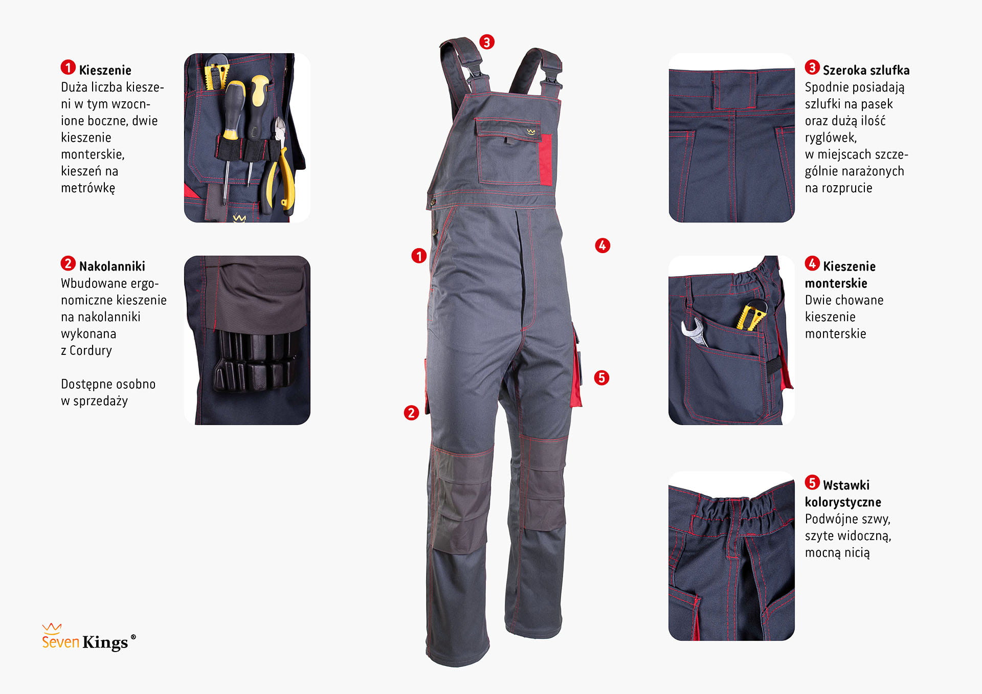 dwie kieszenie w tylnej części spodni, wzmocnione kieszenie zapinane na rzepy, kieszeń na komórkę, dwie kieszonki na długopisy, kieszeń na dokumenty, kieszeń na miarkę „metrówkę”, ergonomiczna kieszeń na nakolanniki wykonana z CORDURY, |